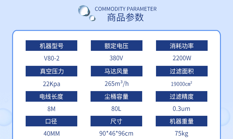 l  耐潔思V80-2是一款工業吸塵器,機器具有漏電,缺相、過熱及過載保護裝置,小型的體積適用于工作區域狹小有不斷有灰塵產生的場所,可固定安裝在大型設備上作為固定吸塵裝置。適用于各類型清理工作非常繁重的工廠。